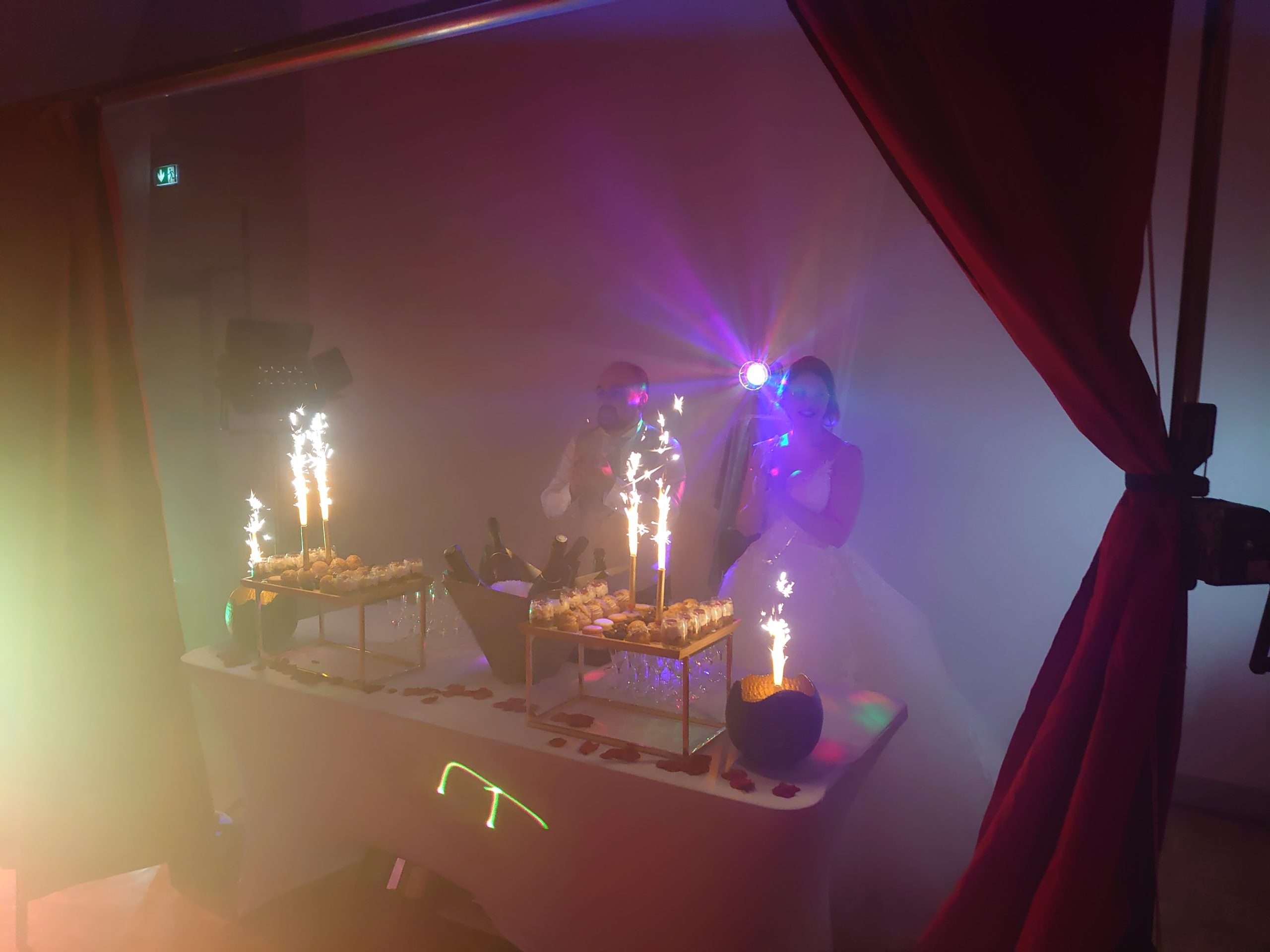 Unique, fantastique. Imaginez : votre buffet de dessert ainsi que vous, êtes cachés derrière un rideau de cabaret. Une intro musicale intrigante commence accompagnée d’une fumée lourde restant aux niveaux des genoux descendant devant vous vers le publique. Après 1min.30s. une musique plus entrainante donne le top de l’ouverture du rideau et de l’apparition d’une fumée plus montante.